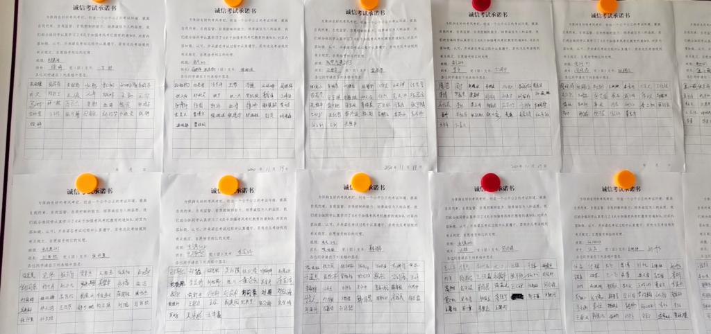 最后,各班级领取并组织班级同学学习《关于加强考风考级教育的通知》,全体同学签订《诚信考试承诺书》,确保每位学生都了解和清楚诚信考试的有关内容及其相关要求。