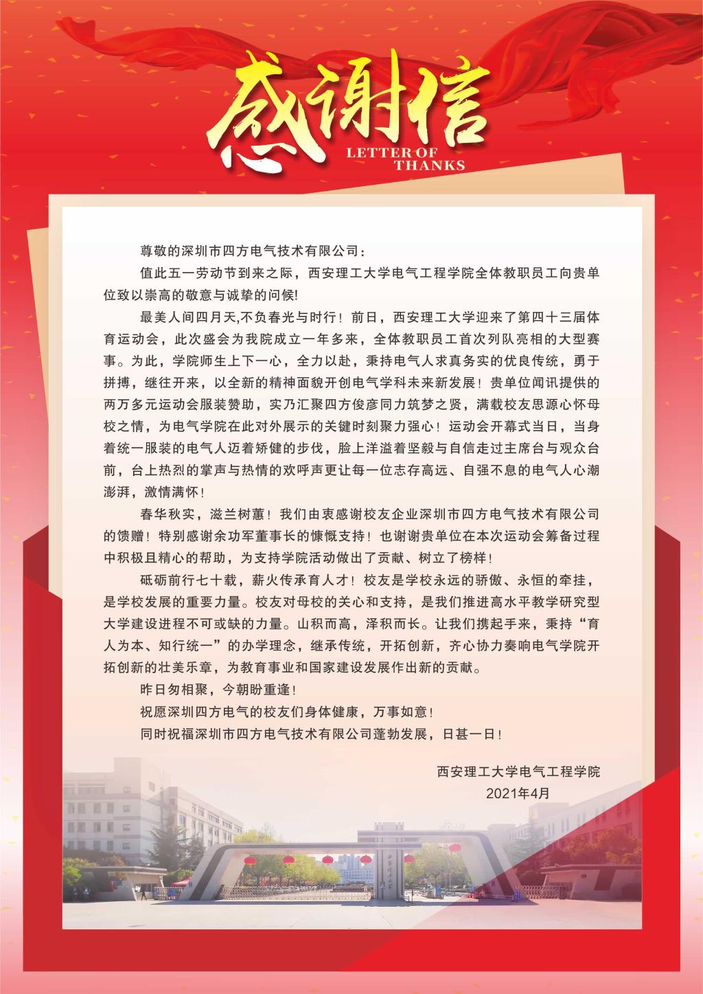 致深圳市四方电气技术有限公司的一封感谢信