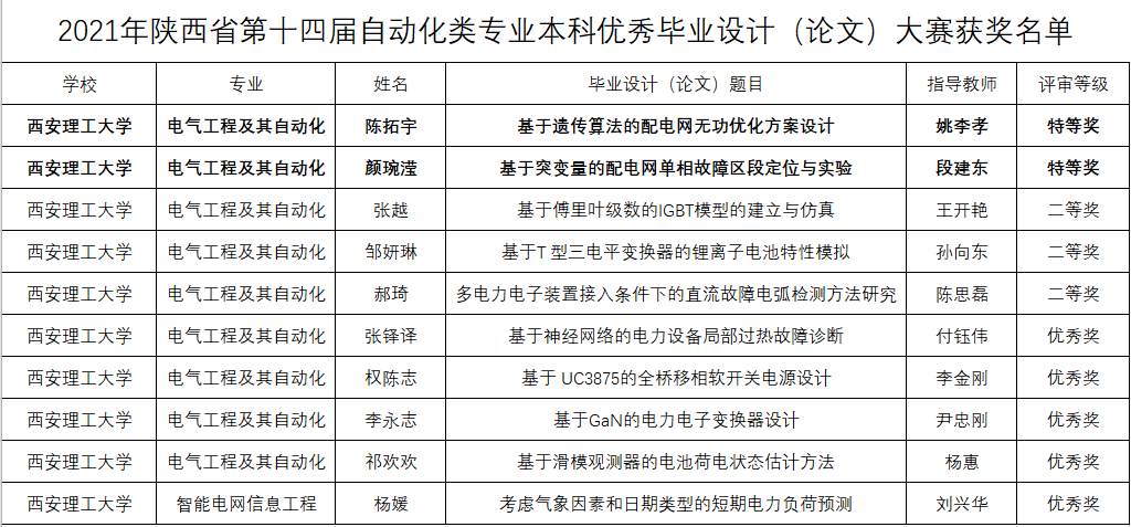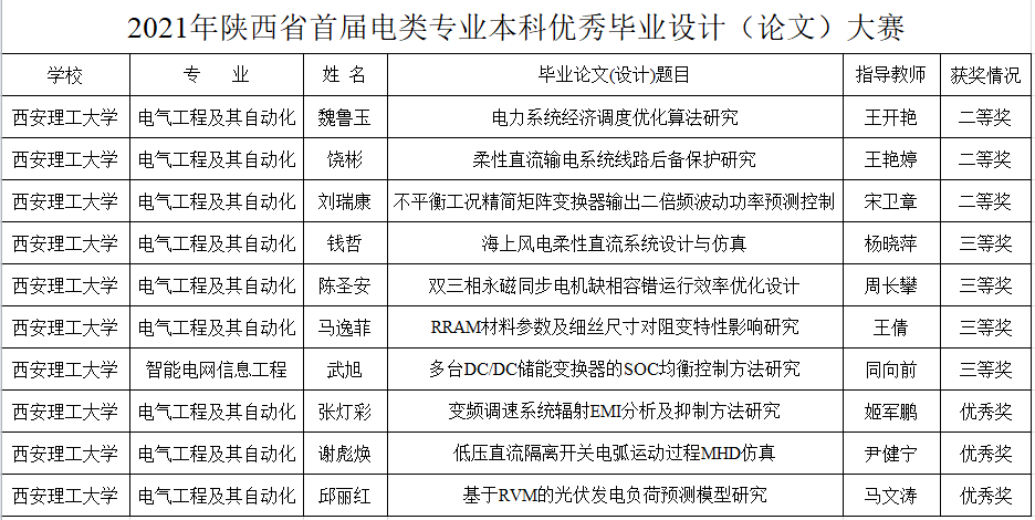 为进一步提高本科毕业设计(论文)质量,培养创新型人才,促进学院本科生专业教育的发展,我院高度重视毕业设计质量的不断提升,积极参加各类优秀毕业设计评选,并屡获佳绩。我院2021届毕业设计分别在陕西省自动化学会、陕西省电源学会及我校组织的优秀毕业设计评选比赛中获得优异成绩。