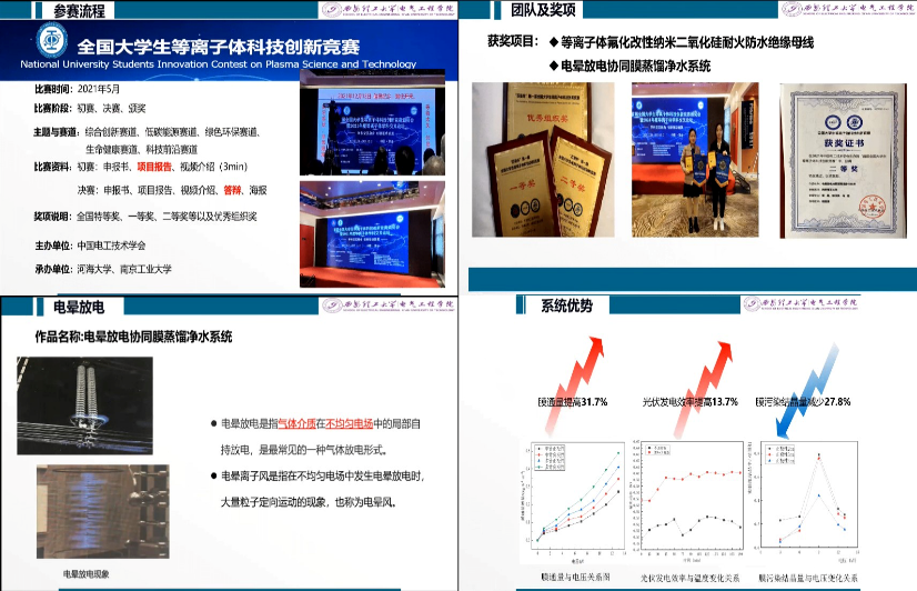 最后一位报告人是我院电气专业硕士一年级学生雷晨同学。雷晨同学所在团队于2021年11月获得了全国首届等离子体创新大赛二等奖。在报告中,雷晨同学结合自身经历,详细分享了等离子体创新大赛的基本情况、团队成果、参赛项目、备赛过程以及经验收获。她认为参加全国性创新创业大赛,是在大学阶段为数不多的与超一流大学学生同台竞技的机会,充满了刺激与挑战。报告最后,雷晨同学还介绍了下一届等离子体创新大赛的举办情况,并勉励参会同学尽早动手、积极备赛、勇闯佳绩。
