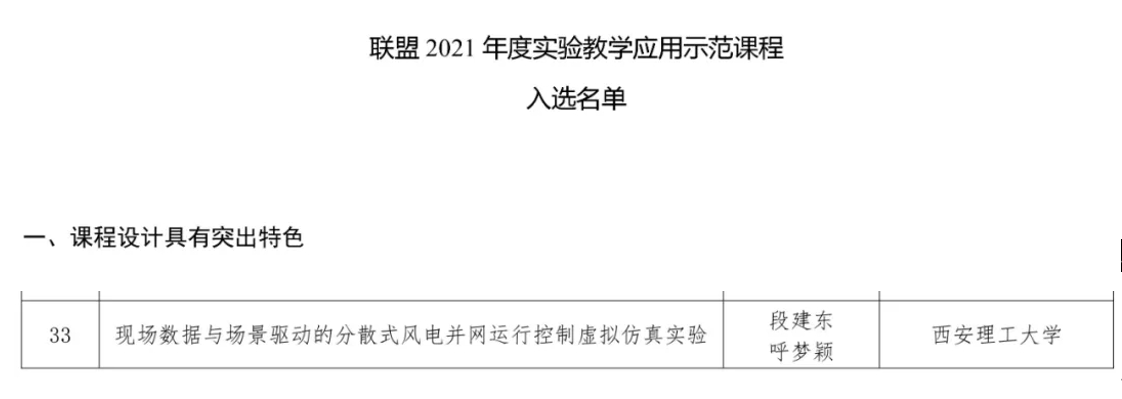 近日,虚拟仿真实验教学创新联盟公布了2021年度实验教学应用示范课程入选名单,电气工程学院段建东教授、呼梦颖老师负责的《现场数据与场景驱动的分散式风电并网运行控制虚拟仿真实验》因课程设计具有突出特色而入选。该课程是我校唯一的国家级虚拟仿真实验教学一流课程,也是陕西省属高校此次唯一入选的实验教学应用示范课程。