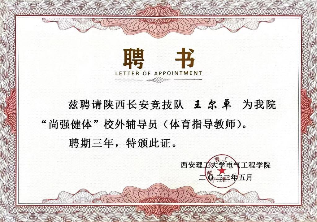 因防疫要求与球队集训等因素,此次聘任仪式采取线上的形式进行。王尔卓对于能出任学院“校外辅导员”感到非常荣幸,他表示,将积极发挥专业运动员优势,全力做好学生体育运动兴趣与技能培养,通过自身专业指导,引导学生重视体育锻炼,缓解学习生活压力,增强身体素质和心理调适能力。同时,他非常期待球队回到西安后,本人亲自来到学院,现场实地教学指导,让学生掌握科学、规律、健康的运动方法,形成自觉锻炼、主动健身、追求健康的良好氛围。