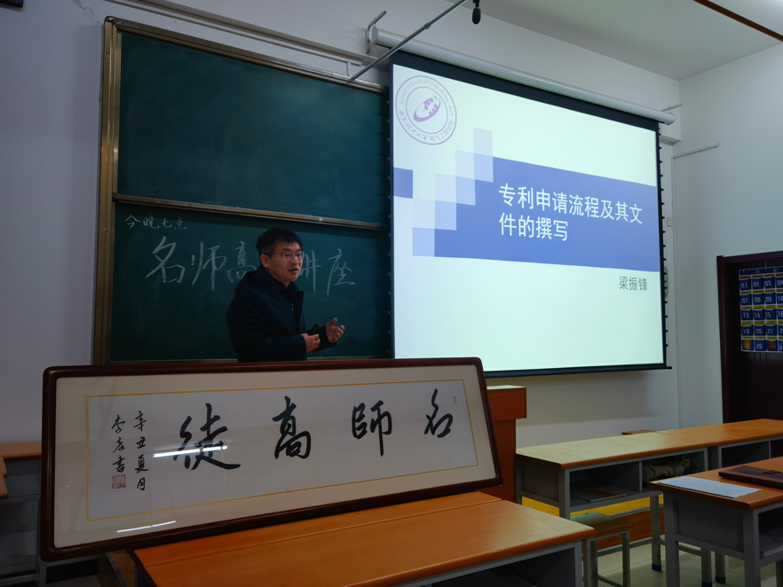 讲座上,梁振锋副教授开门见山地点明了讲座主题--专利申请及意见陈述书的撰写。他结合自身工作经验和案例,从专利是什么、怎么获得专利、如何撰写专利、专利申请流程及时间为研究生详细介绍了专利的相关知识,让大家对知识产权、发明创造的来源、专利授权的条件、专利审批的流程等有了清晰的了解,激发了研究生申报专利的热情和信心。