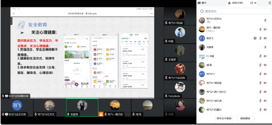 刘晨雪从学业管理、安全教育、心理健康教育、日常管理制度等方面进行详细说明,并再次强调:一是要关注自己的学分绩点,做好学业自查,避免不满足毕业条件影响正常毕业;二是要严格坚持请销假制度,严肃考风考纪,避免因违纪处分影响如期毕业;三是面对考研和就业,要调整好个人心态,提高安全意识,增强抗压能力,诚信、从容应对考试与应聘。希望同学们能够保持积极向上的心态和直面困难的勇气,努力实现个人价值,顺利步入新的人生阶段。