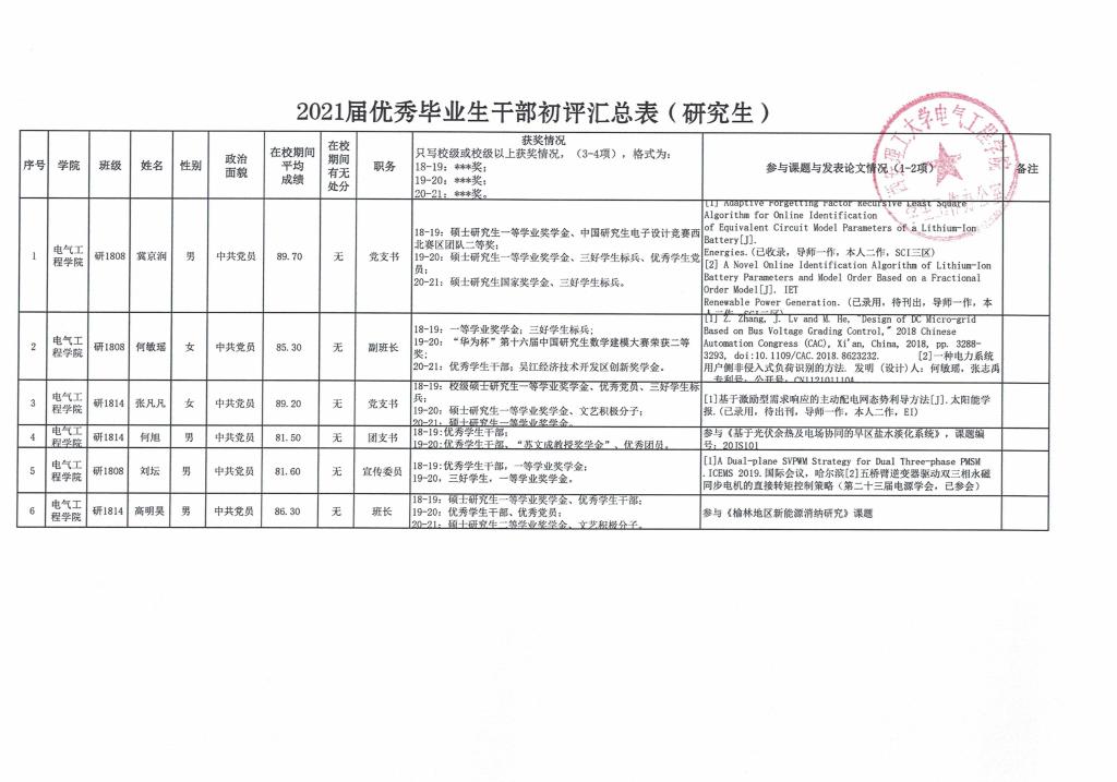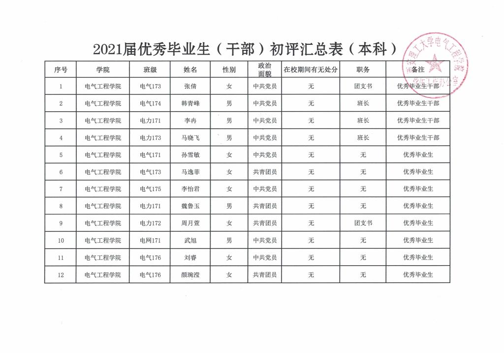 电气工程学院2021届优秀毕业生、优秀毕业生干部初评名单公示